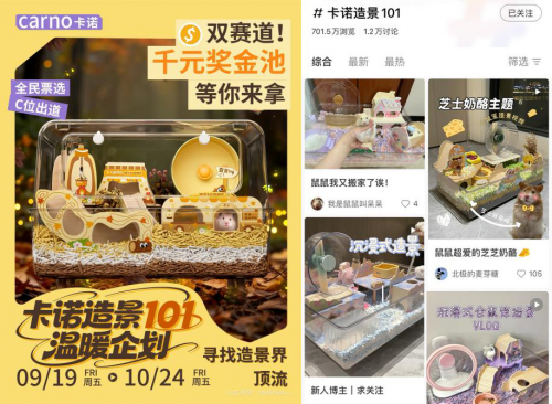 秋冬换季,寒意渐浓,一股为小宠打造温馨家园的创意暖流却在线上澎湃涌动。由小宠品牌卡诺carno发起的“卡诺造景101:温暖企划全民票选!C位出道!”活动自启动以来,迅速点燃了全国小宠主人的创作热情,仓鼠的“秋日森林”、鸟儿的“暖冬城堡”等创意作品持续刷屏。这些充满巧思的温馨小窝,不仅保障了小宠安稳过冬,更诠释着宠物与主人之间独特的治愈联结。